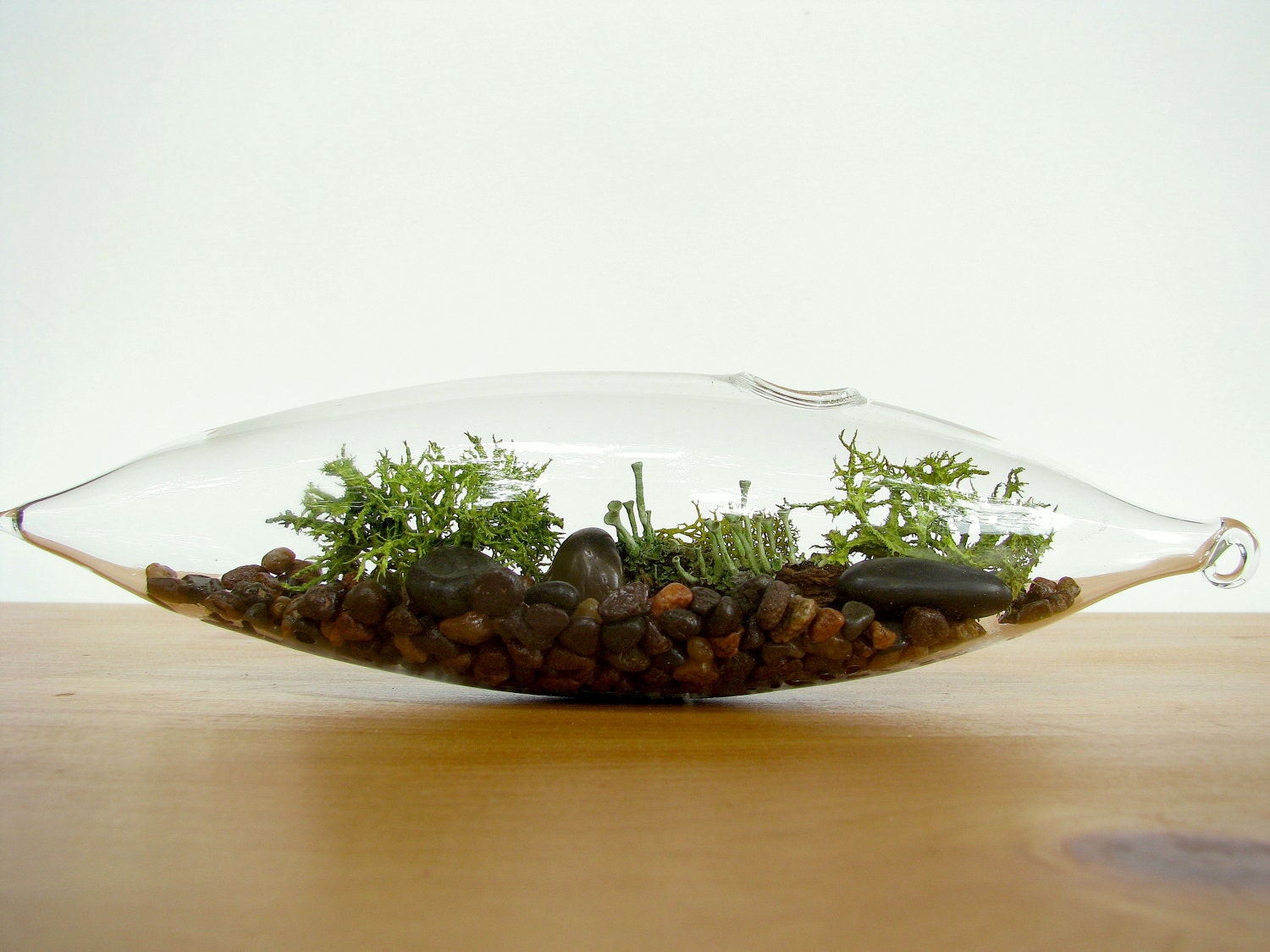 Unique glass terrarium. Landscape your own sleek glass vessel with some extraterrestrial plant life... these lichens appear to be from another planet. The terrarium comes with Wolf lichen and Cladonia Cup lichen. The lichens lie on a bed of polished stones.