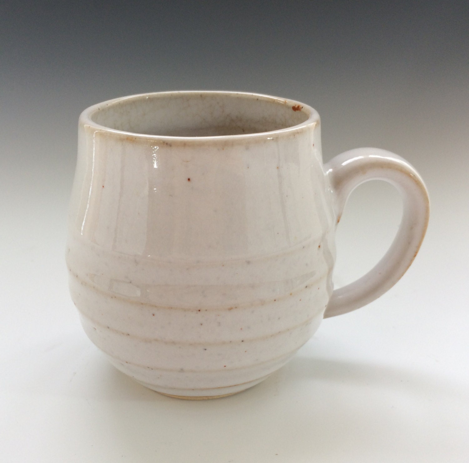 This is a wheel thrown coffee mug in a fantastic white shino glaze